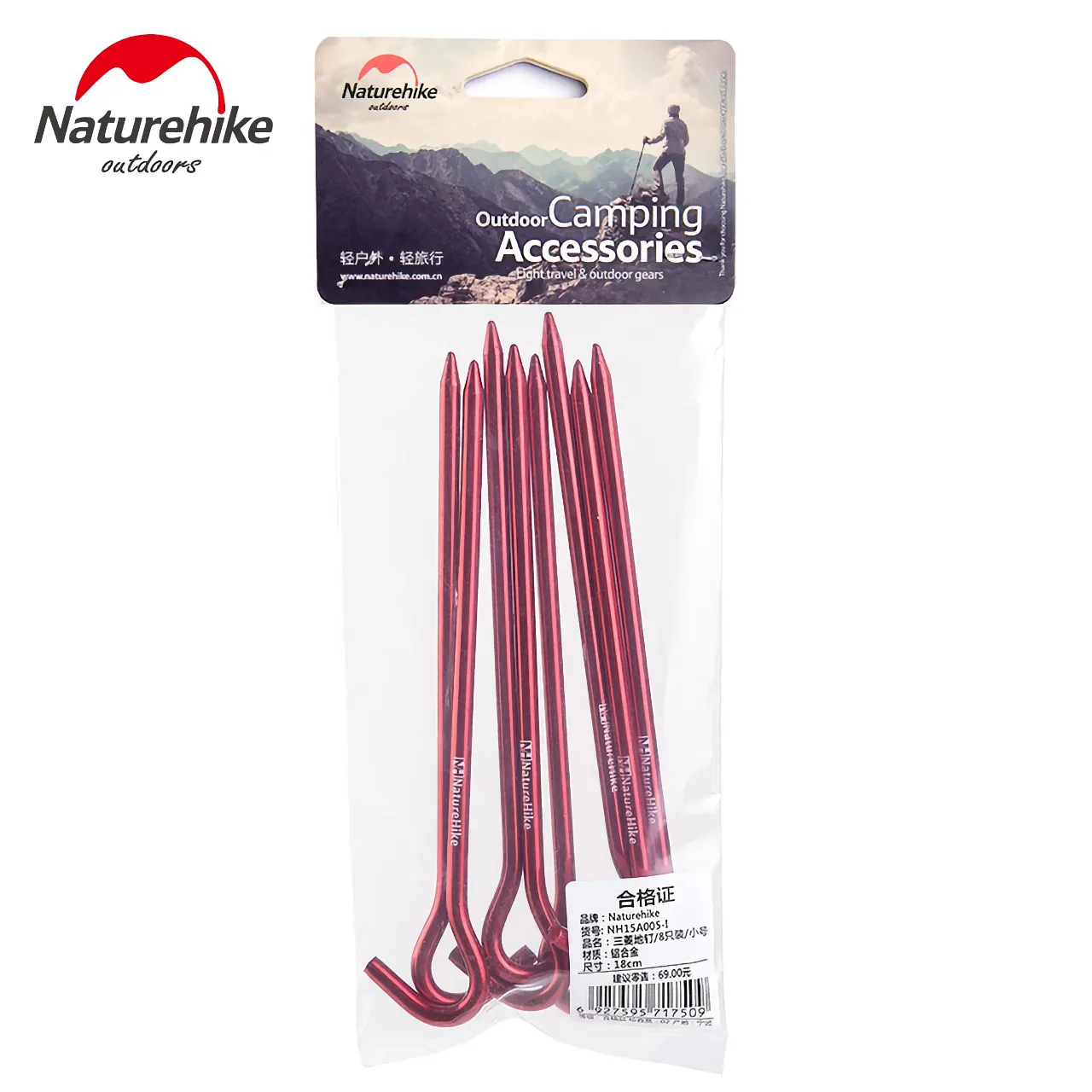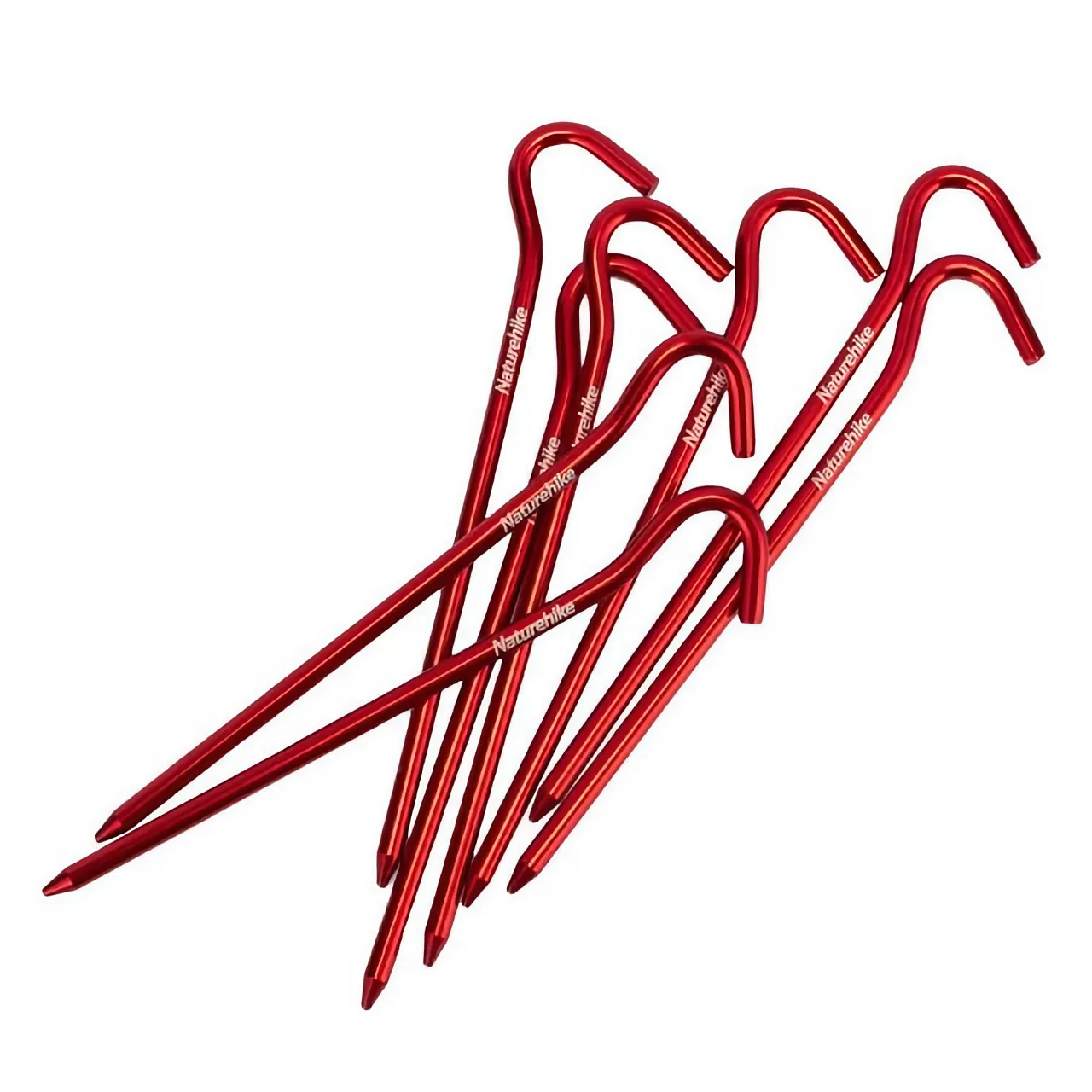 Zestaw 8 szpilek marki Naturehike w jaskrawym, czerwonym kolorze, dzięki któremu nareszcie łatwo je odnaleźć w trawie.Szpilki mają długość 18cm i wykonane są z aluminium 7001.